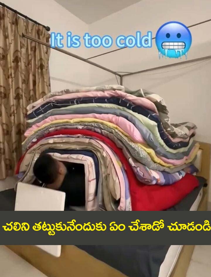 ప్రస్తుతం తెలుగు రాష్ట్రాలతో పాటు దేశంలో చలి చంపేస్తోంది. ఉత్తర భారతదేశంలో ఇంకా ఘోరమైన పరిస్థితులు ఉన్నాయి. అయితే ఇక్కడో వీడియో చూడండి ఓ వ్యక్తి చలిని తట్టుకోవడానికి ఓ ఉపాయం పన్నాడు. మంచంపై ఓ పెట్టేను పెట్టాడు. దానిపై చద్దర్లను పెట్టాడు. అనంతరం ఆ పెట్టలోకి వెళ్లి మూత పెట్టుకున్నాడు. చలి నుంచి తనను తాను రక్షించుకునేందుకు చేసిన పనిని చూసి నెటిజన్లు తెగ నవ్వుకుంటున్నారు. ఎక్కడ జరిగిందో తెలియదు కానీ నెట్టింట్లో మాత్రం పువ్వులు పూయిస్తోంది.