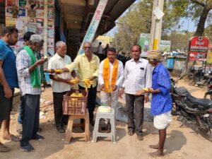 పార్టీ నేతలు కేక్ కట్ చేసి మిఠాయిలు మరియు ప్రసాదాలను ప్రజలకు పంపిణీ చేశారు.