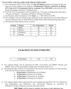 Polycet” తెలంగాణ రాష్ట్ర మాధ్యమిక విద్య బోర్డు నిర్దేశించిన విధంగా 2024-2025 విద్యా సంవత్సరంలో జరిగిన పదో తరగతి (X తరగతి) (S.S.C.) పరీక్ష యొక్క గణితం, భౌతిక శాస్త్రం, రసాయన శాస్త్రం & జీవశాస్త్రం సబ్జెక్టులలో సిలబస్ నుంచి ప్రవేశ పరీక్ష ప్రశ్నలుంటాయి. ఒకే ఒక పేపర్తో కూడిన పరీక్ష (POLYCET) 2 గంటల 30 నిమిషాల వ్యవధిలో ఉంటుంది.