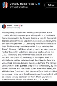 వాషింగ్టన్/న్యూఢిల్లీ: గత 20 రోజులుగా పశ్చిమాసియాను అతలాకుతలం చేస్తున్న యుద్ధం త్వరలోనే ముగియవచ్చని అమెరికా అధ్యక్షుడు డొనాల్డ్ ట్రంప్ సంకేతాలిచ్చారు. మార్చి 20 (శుక్రవారం) నాడు తన ‘ట్రూత్ సోషల్’ వేదికగా ఆయన చేసిన పోస్ట్, అంతర్జాతీయ ఇంధన సంక్షోభంలో ఉన్న భారత్ వంటి దేశాలకు కొంత ఊరటనిచ్చేలా ఉంది.