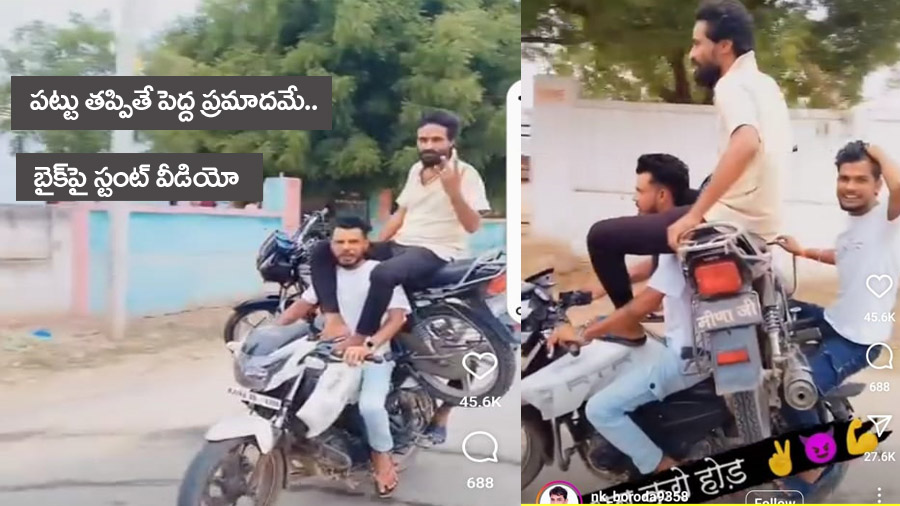 Viral Video” నేటి యువత సోషల్ మీడియాలో గుర్తింపు కోసం యువత పాకులాడుతున్నారు. దాని కోసం ఎంతటి దాకా అయినా తెగిస్తున్నారు. కొన్ని సార్లు అవి ప్రాణం మీదికి కూడా వస్తోంది. కొంత మందిప్రాణాలు కూడా పోతున్నాయి.. అయినా యువతలో మాత్రం మార్పు రావడం లేదు. ప్రాణాలను రిస్క్లో పెట్టి వీడియోలు చేస్తున్నారు. అటువంటి వీడియోనో ఇప్పుడు నెట్టింట వైరల్ అవుతున్నది. ముగ్గురు యువకులు చేసిన స్టంట్ చూస్తే ప్రాణాలు అరచేతిలో పెట్టుకోవాల్సిందే.. ఓ బైక్ మీద అడ్డంగా మరో బైక్ పెట్టారు. మొదటి బైక్ను ఓ వ్యక్తి నడిపారు. మధ్యలో అడ్డంగా బైక్ పెట్టారు. ఈ బైక్ వెనకాల మరో వ్యక్తి కూర్చున్నాడు. అడ్డంగా పెట్టిన బైక్పై ఇంకొక వ్యక్తి కూర్చొని అతని రెండు కాళ్లను బైక్ నడుపుతున్న వ్యక్తి మెడలపై పెట్టాడు. ఇలా రోడ్డుపై దూసుకెళ్లారు. చూసే వాళ్లు మాత్రం పట్టు జారితే ప్రాణాలు మిగలవు అంటూ కామెంట్ చేశారు. ఈ వీడియో nk_boroda9358 ఇన్స్టా గ్రాం ఖాతాలో షేర్ చేశారు. వీడియోకు నెట్టింట విపరీతమైన వ్యూస్ వస్తున్నాయి. మీరు చూసేయండి మరి..